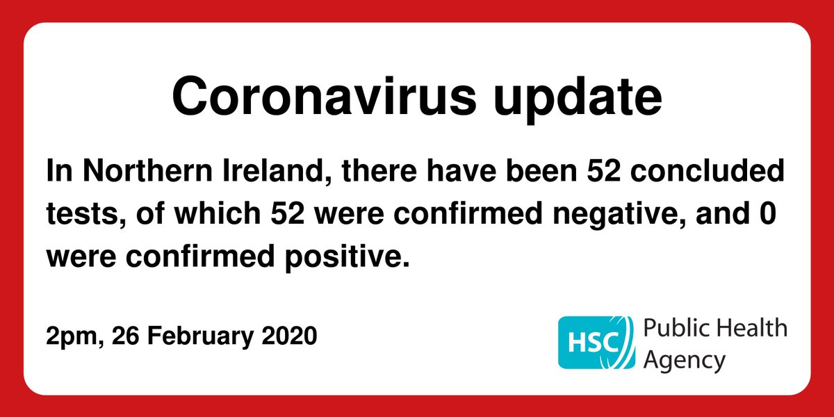 Public Health Agency On Twitter Coronavirus Update 2pm 26 February 2020 No Cases Of Covid 19 Have Been Diagnosed In Northern Ireland Since Testing Began 52 Tests Have Been Completed And