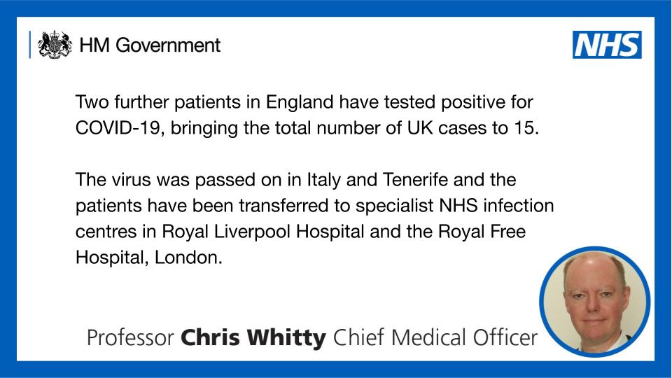 Department Of Health And Social Care On Twitter Update On Coronavirus Two Further Patients In England Have Tested Positive For Covid19 Bringing The Total Number Of Uk Cases To 15 Patients Have